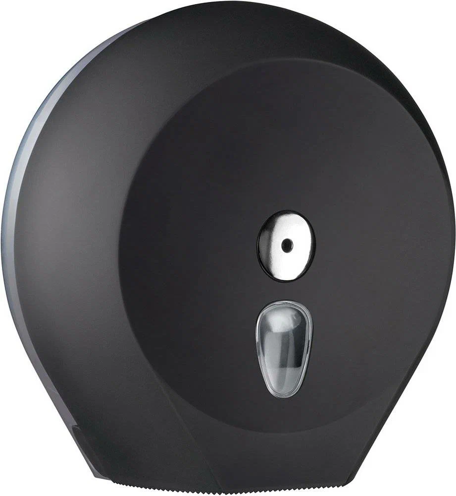 Диспенсер для туалетной бумаги круглый из пластика чёрный. Оборудован антивандальным замком и окошком для контроля наличия туалетной бумаги. Данное оборудование является продолжением диспенсера 05011 серии Black, единственное их различие - размер. 05012 предназначен для рулонов 250-500 м. Компактный держатель для туалетной бумаги серии Black отлично подойдет для ресторанов, баров и прочих мест со средней проходимостью, которые желают подчеркнуть свой изысканный стиль. При создании диспенсера используется особый вид ABS пластика черного цвета матового оттенка. Этот вид пластика очень приятен на ощупь и безусловно порадует каждого не только визуально! Гарантия на это устройство предоставляется от производителя в течение 2 лет с момента покупки!