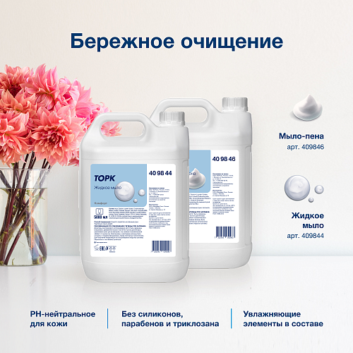Торк мыло жидкое 5 литров отвечает принципам устойчивого развития: на 99% биоразлагаемая формула; не содержит силиконов и полимерных гранул, оказывающих негативный эффект на окружающую среду, накапливаясь в водных ресурсах и земной поверхности; не содержит триклозана и парабенов; pH-нейтрально. Подходит для регулярного мытья рук. Проверено дерматологами. Продукт российского производства – нет проблем с поставками.